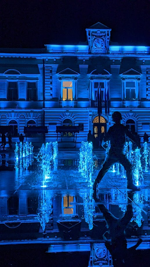 A navečer, kada s posljednjim zrakama sunca nestane dječje vriske, u mirnom zrcalu fontane ostane samo odraz osvijetljene gradske vijećnice. Prostor se smiri i promijeni tempo.