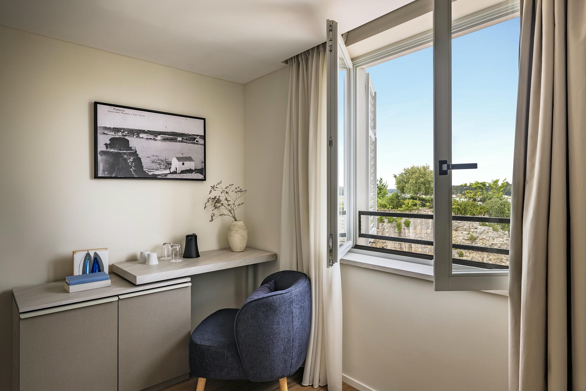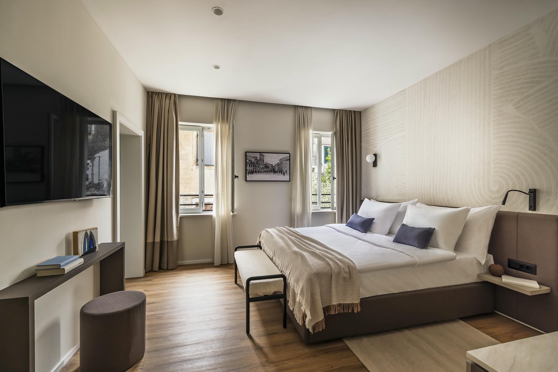 U javnim prostorima, poput hodnika, postavljene su slike na platnu s motivima starog grada Poreča, uokvirene u elegantne drvene okvire. Ovi prizori grada povezuju interijer s lokalnim identitetom i podsjećaju goste na bogatu povijest mjesta u kojem borave.