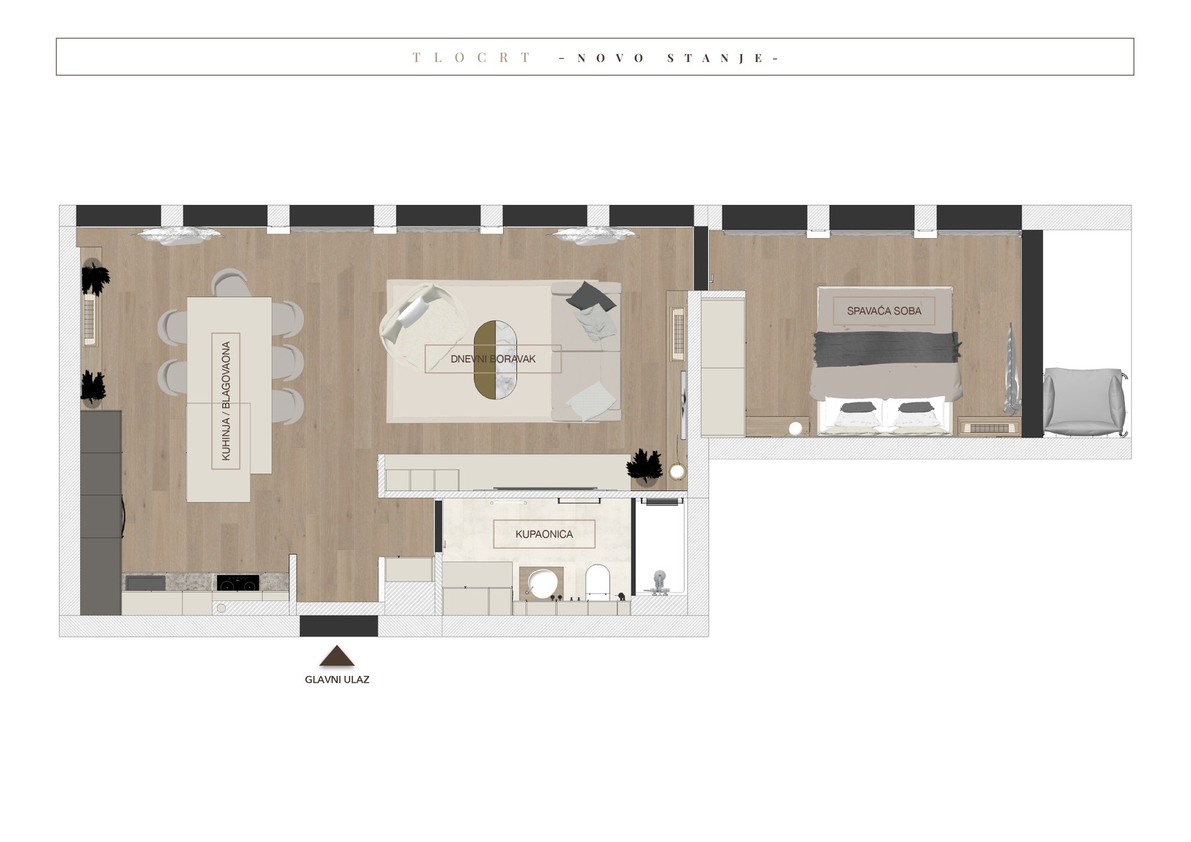 Od kompletne kuhinje s otokom, novog pregradnog zida "obučenog" u ogledalo, do TV elementa u dnevnom boravku, kupaonskih ormarića i drvenih zidnih obloga, sve je napravljeno prema nacrtu dizajnerice, dok je za izvedbu i montažu namještaja zaslužan obrt Di Legno.
