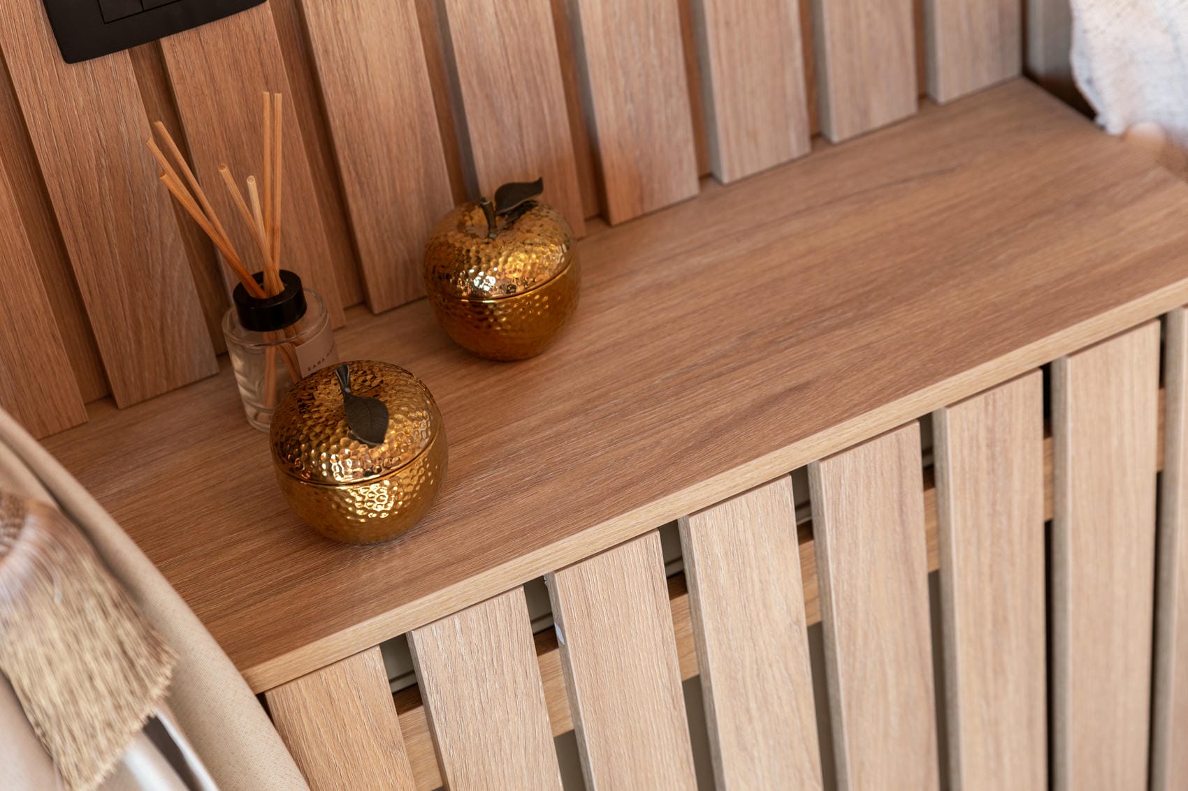 "Sad će netko sigurno komentirati: Evo još jedne letvice u nizu! E pa one su ovdje postavljene s razlogom – unutar njih smo sakrili nadgradne fan coil jedinice za grijanje i hlađenje. Tako je, na primjer, u spavaćoj sobi s desne strane kreveta skriven fan coiler, dok se s druge nalazi noćni ormarić."