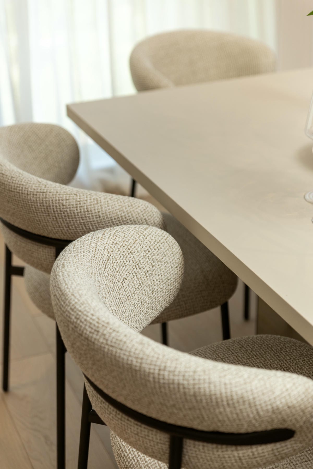 Stol koji se nastavlja na kuhinjski otok izveden je od istog materijala kako bi se uklopio u kompletnu kuhinju, ali i ostatak interijera.