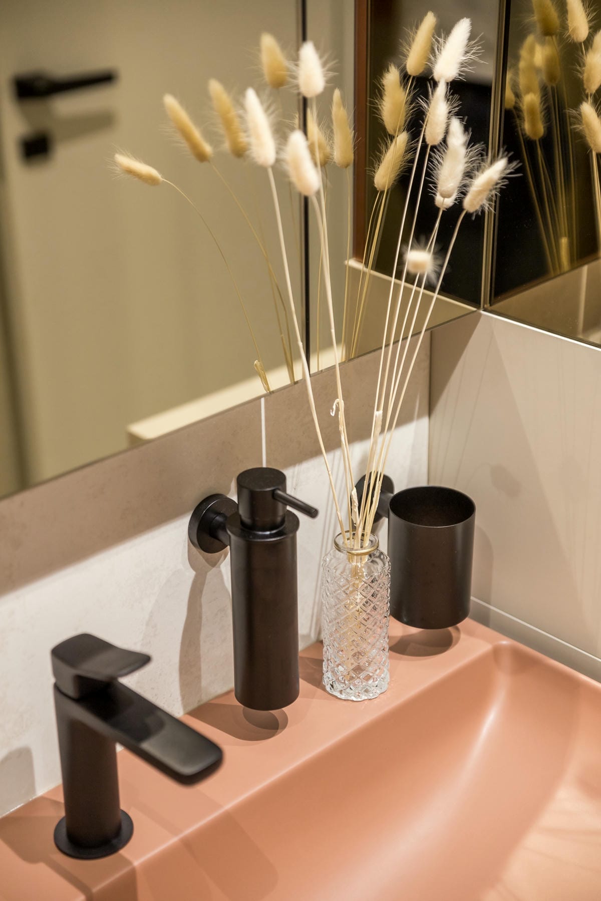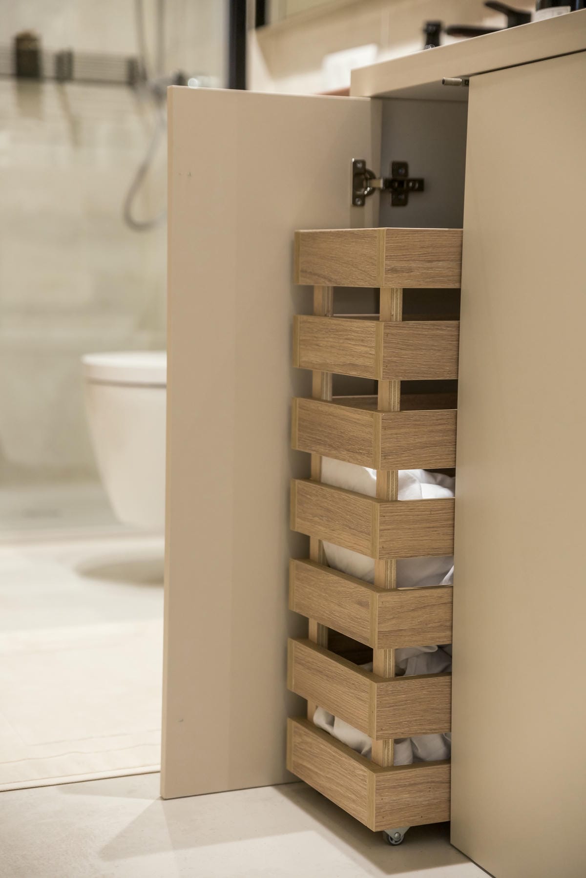 S obzirom na to da je dizajnerica kupaonicu zatekla nedovoljno opremljenom, s premalenom tuš kadom i umivaonikom, odlučilo se da se cijela izradi na novo po mjeri, kako bi se naposljetku stvorila opuštajuća oaza kojom dominiraju umirujuće boje.
