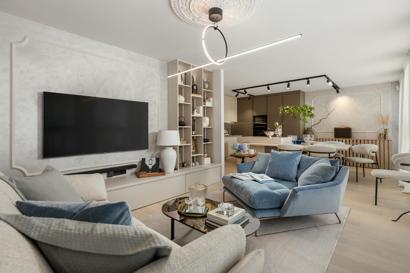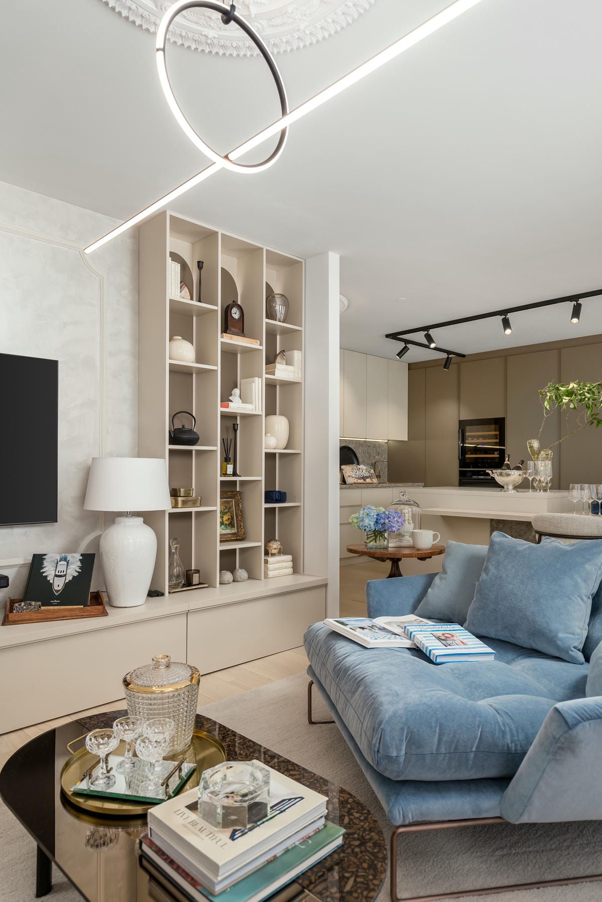 "Suprotno od tamnih, snažnih tonova kakve biste očekivali u jednom tipičnom muškom stanu, investitor je u ovom slučaju inzistirao na kremastom, svijetlom interijeru, no u jednom se trenutku, kada smo birali kauč, odlučio i za plavu fotelju, a što je za sobom povuklo odabir plavih dekoracija koje su podigle cijeli prostor."