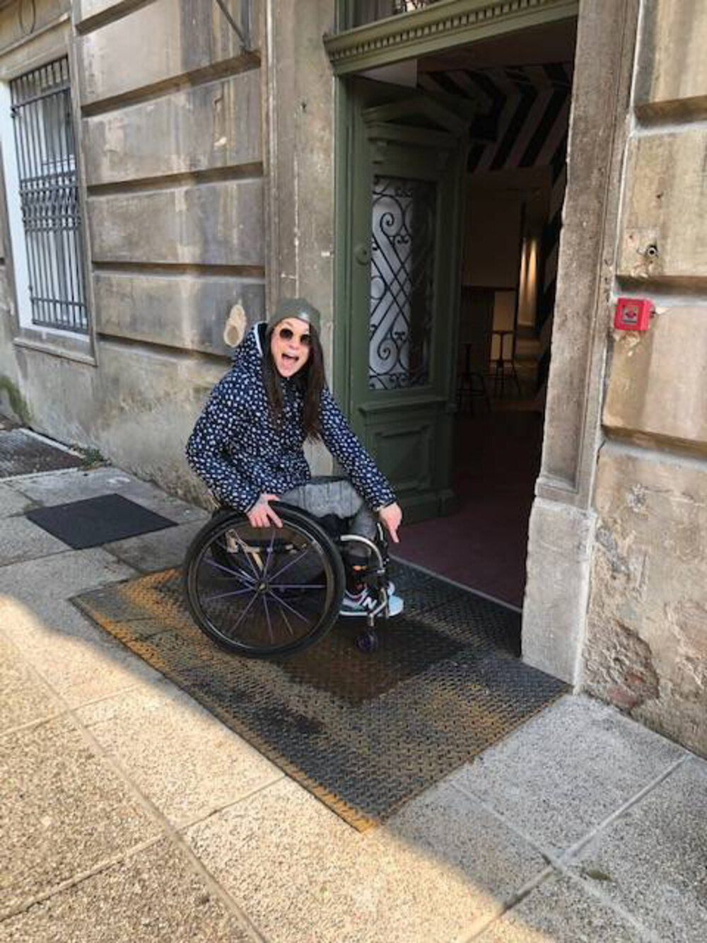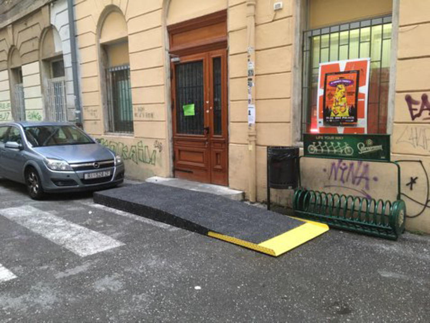 Umjesto standardne stigmatizirajuće rampe, na ulazu u riječki Omladinski kulturni centar Palach postavljena je decentna rampa, bojom i oblikom istaknutih rubovima radi bolje vidljivosti i taktilne komunikacije bijelim štapom; dizajn Sanja Bencetić