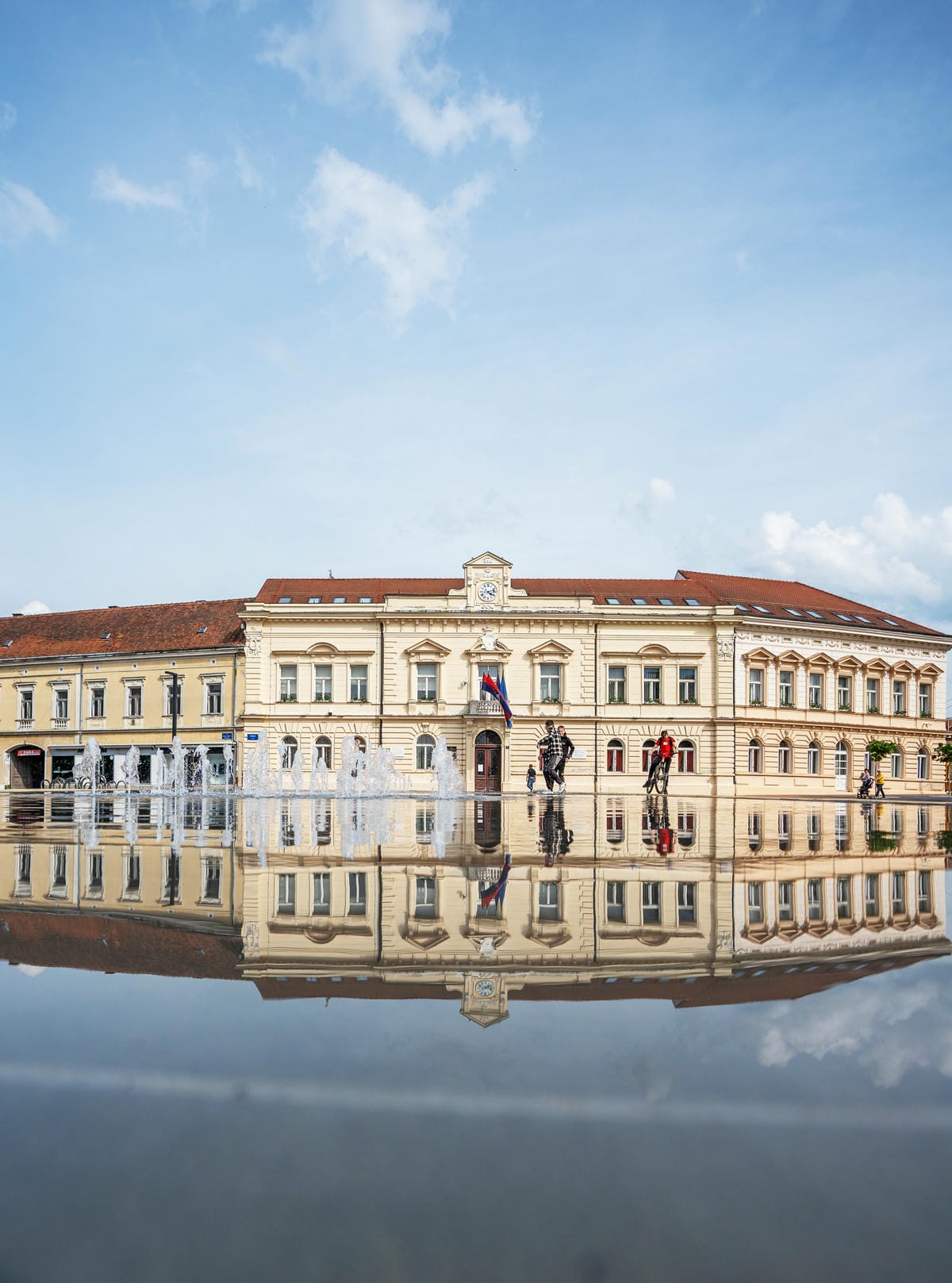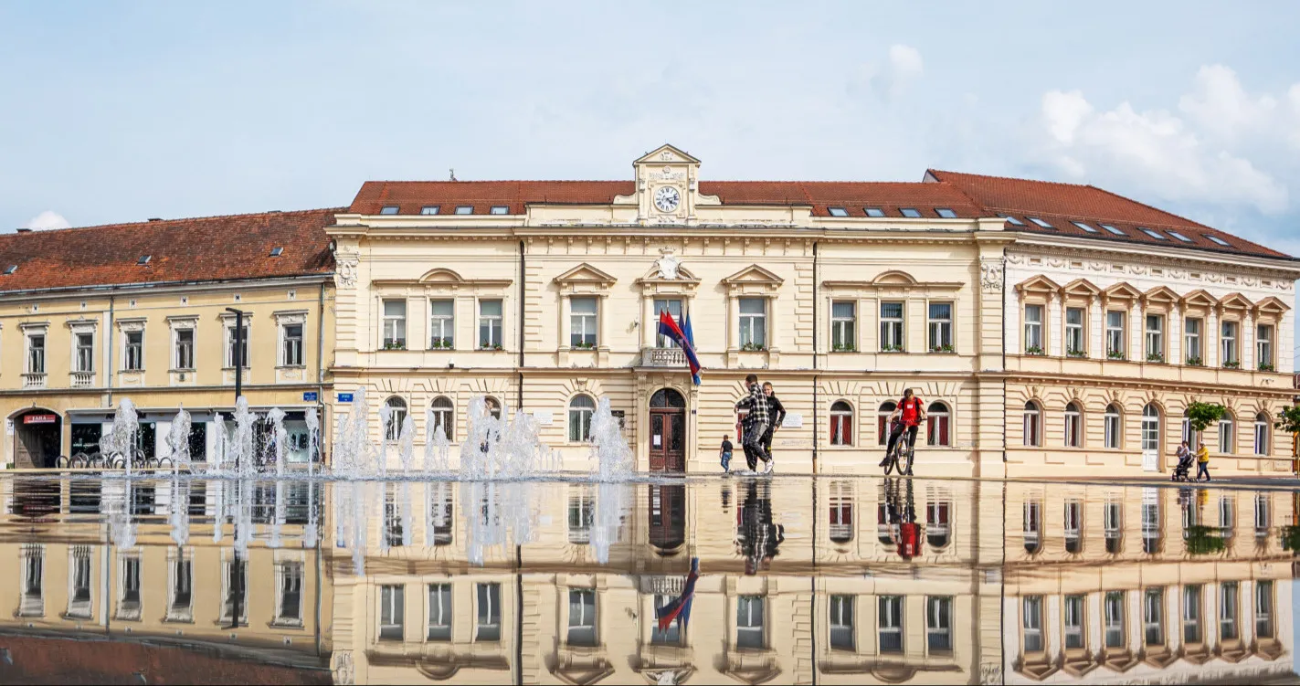 A navečer, kada s posljednjim zrakama sunca nestane dječje vriske, u mirnom zrcalu fontane ostane samo odraz osvijetljene gradske vijećnice. Prostor se smiri i promijeni tempo.