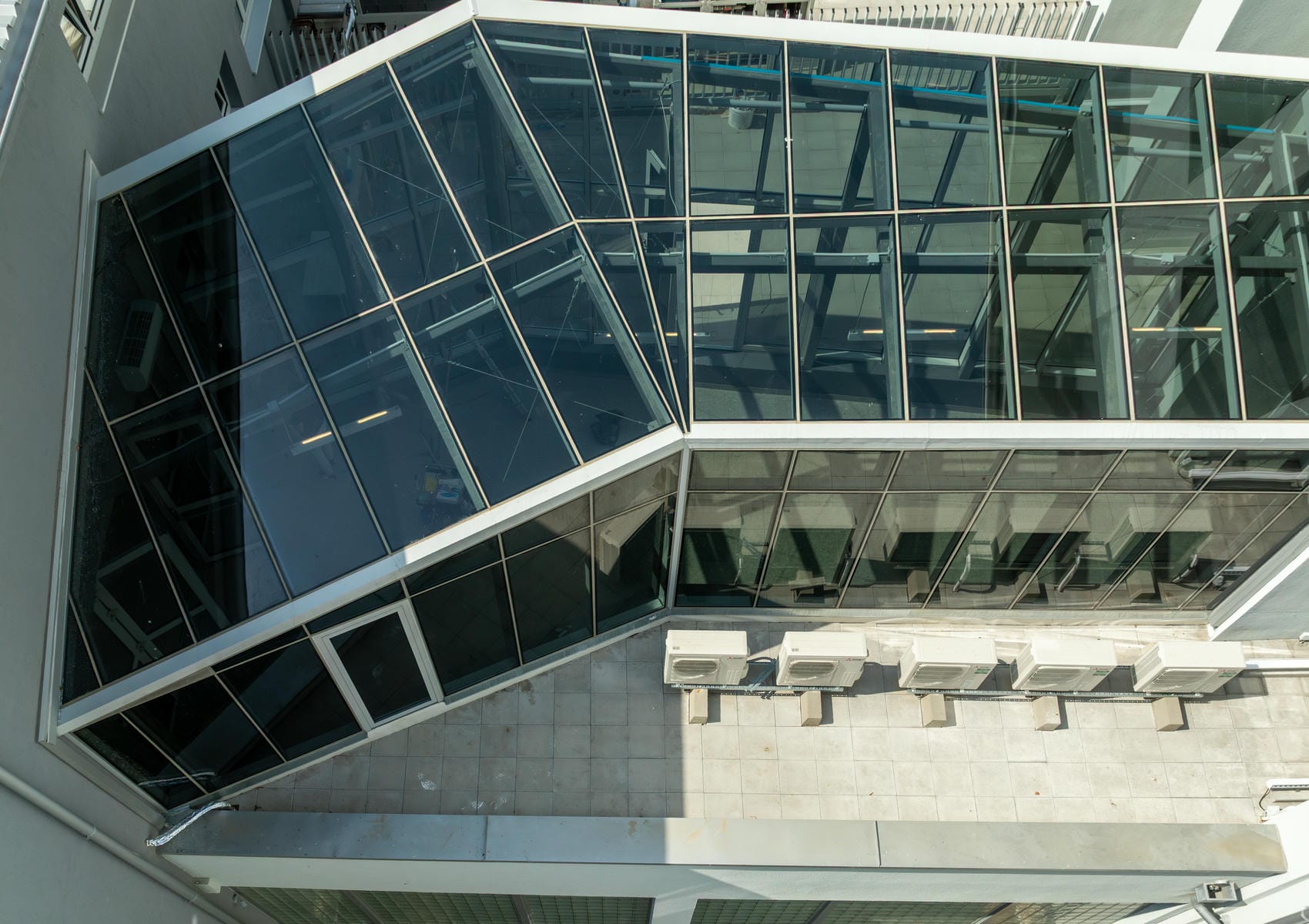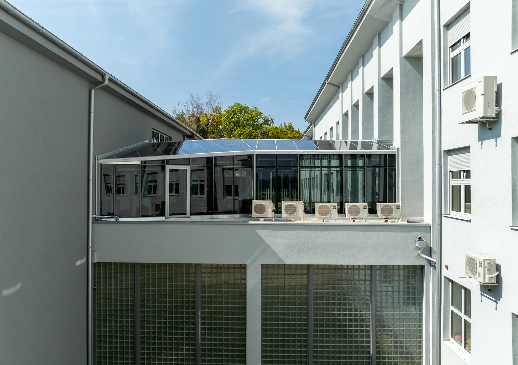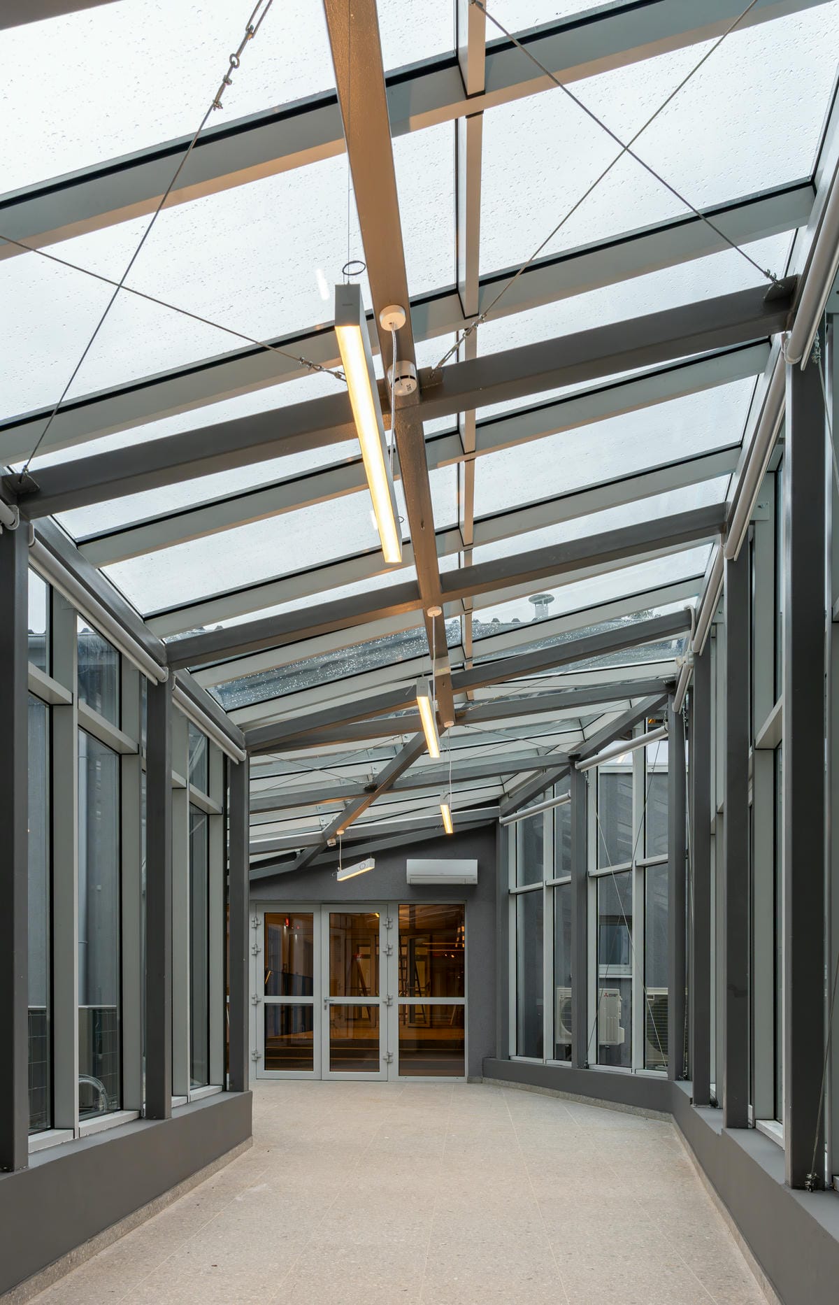 "Na ravnom krovu tople veze planiran je dodatni spoj koji povezuje zgradu Paviljona IV i aneksa na drugom katu u vidu ostakljenog prolaza sa svih strana, s čeličnom nosivom konstrukcijom i zaštitom od sunca u obliku unutarnjih rolo sjenila s vodilicama na elektromotoru, postavljenih na frontama i na krovu. Taj spoj jedina je dodatna intervencija na pročeljima u odnosu na zatečeno stanje."