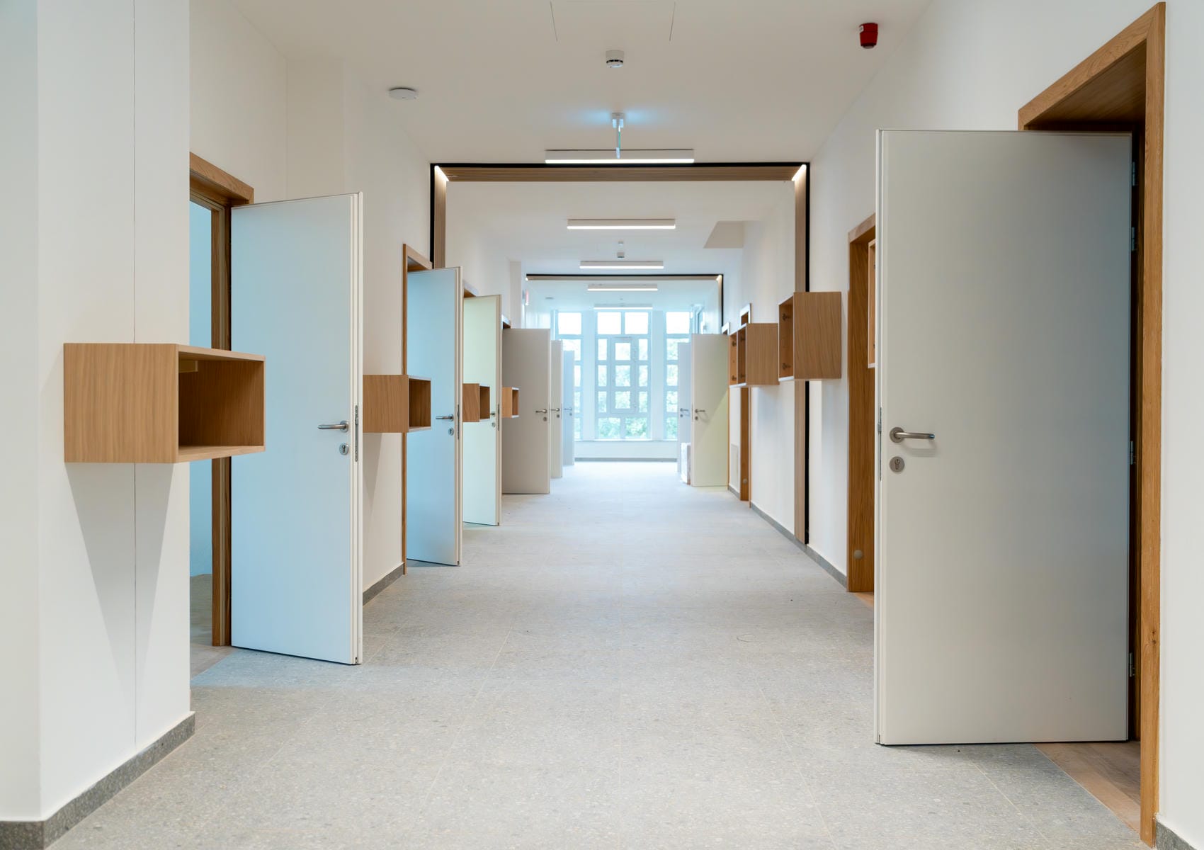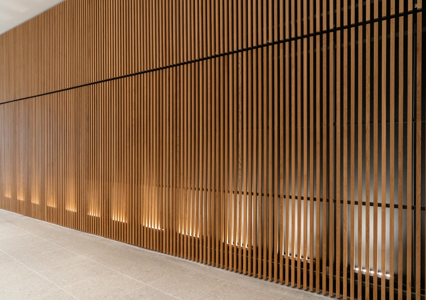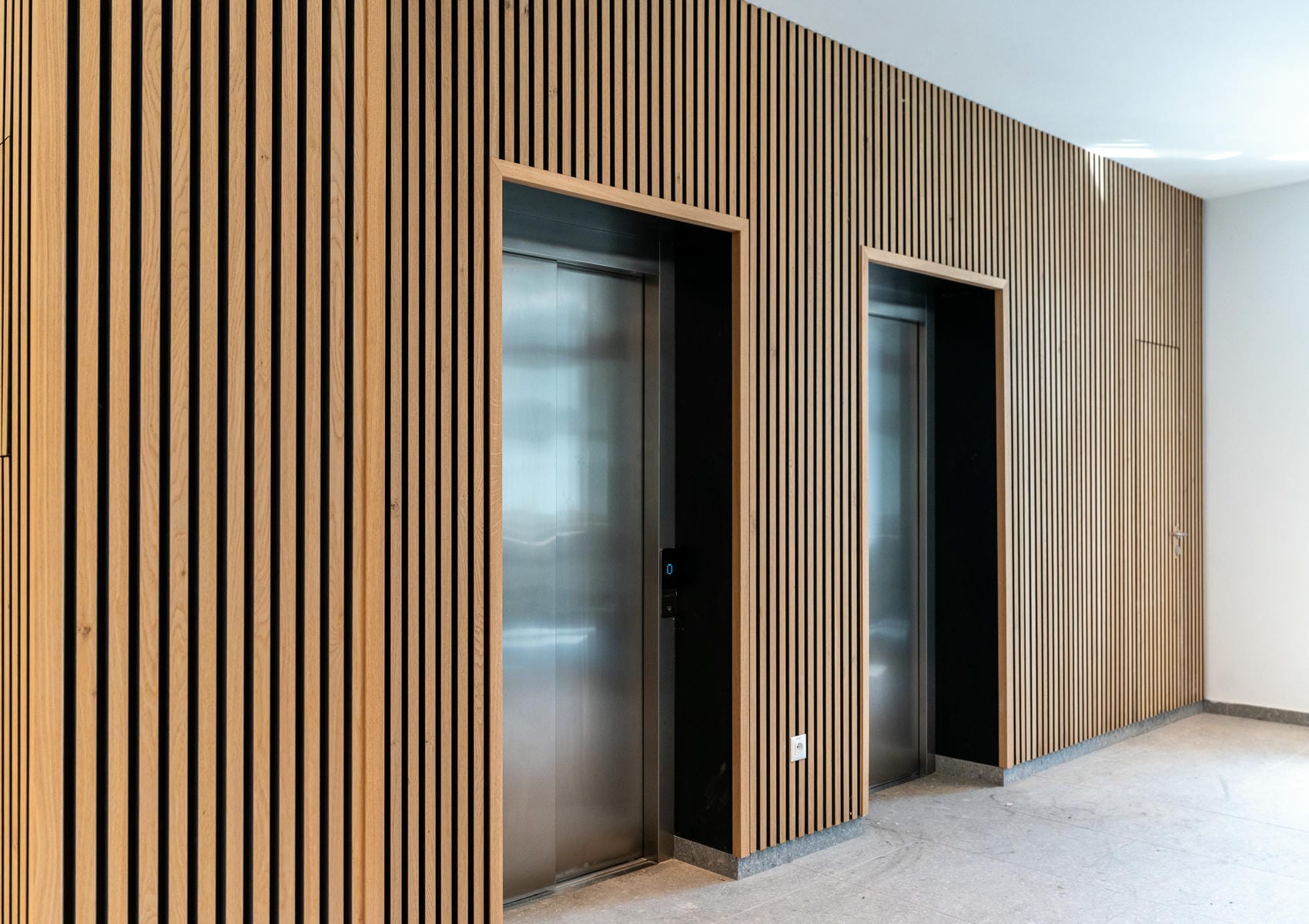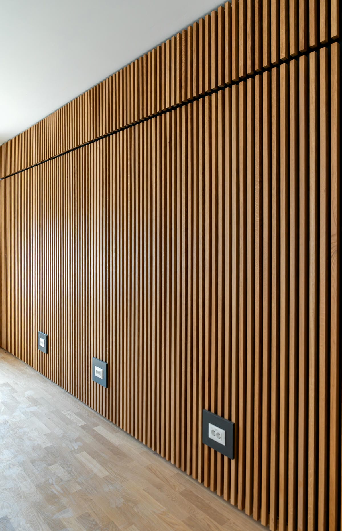 U dijelu centralnog stubišta i glavnih hodnika zidovi su djelomično obloženi akustik drvenim lamelama od svijetlog hrasta različitih širina obloge s ugrađenom linijskom rasvjetom kako bi se vizualno skratila dužina hodnika i poboljšala akustika.