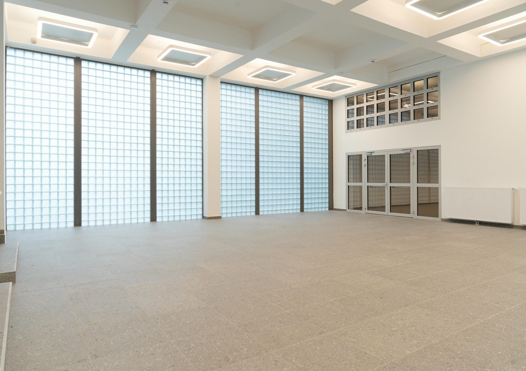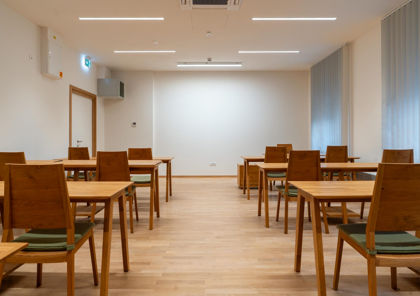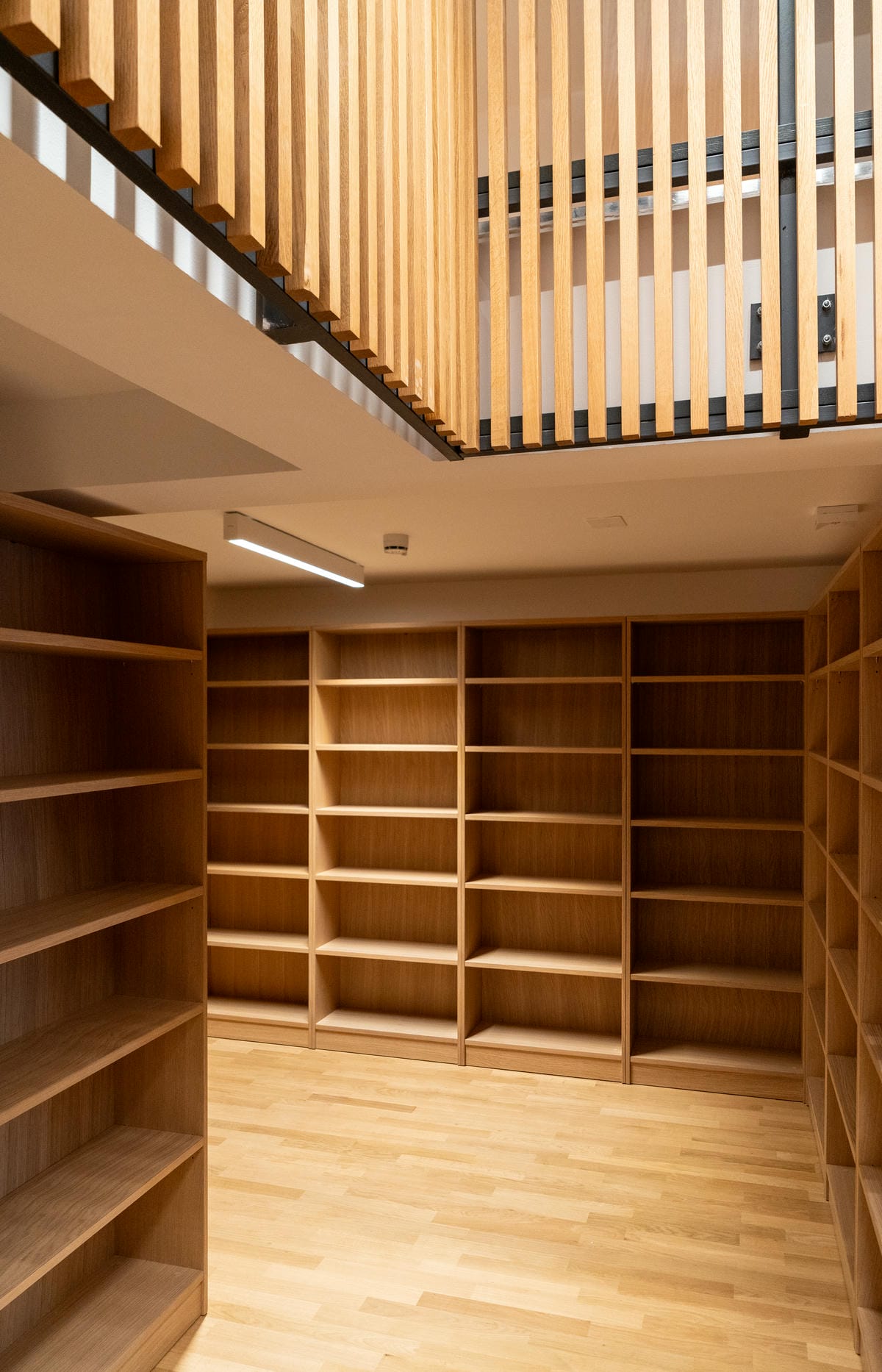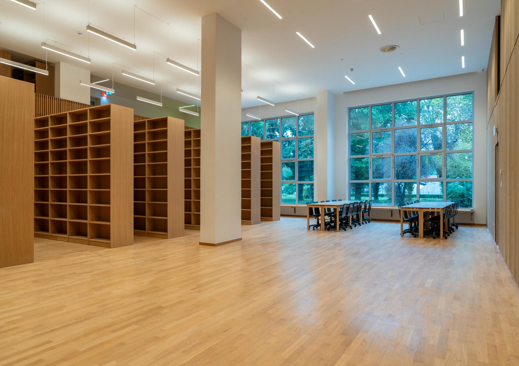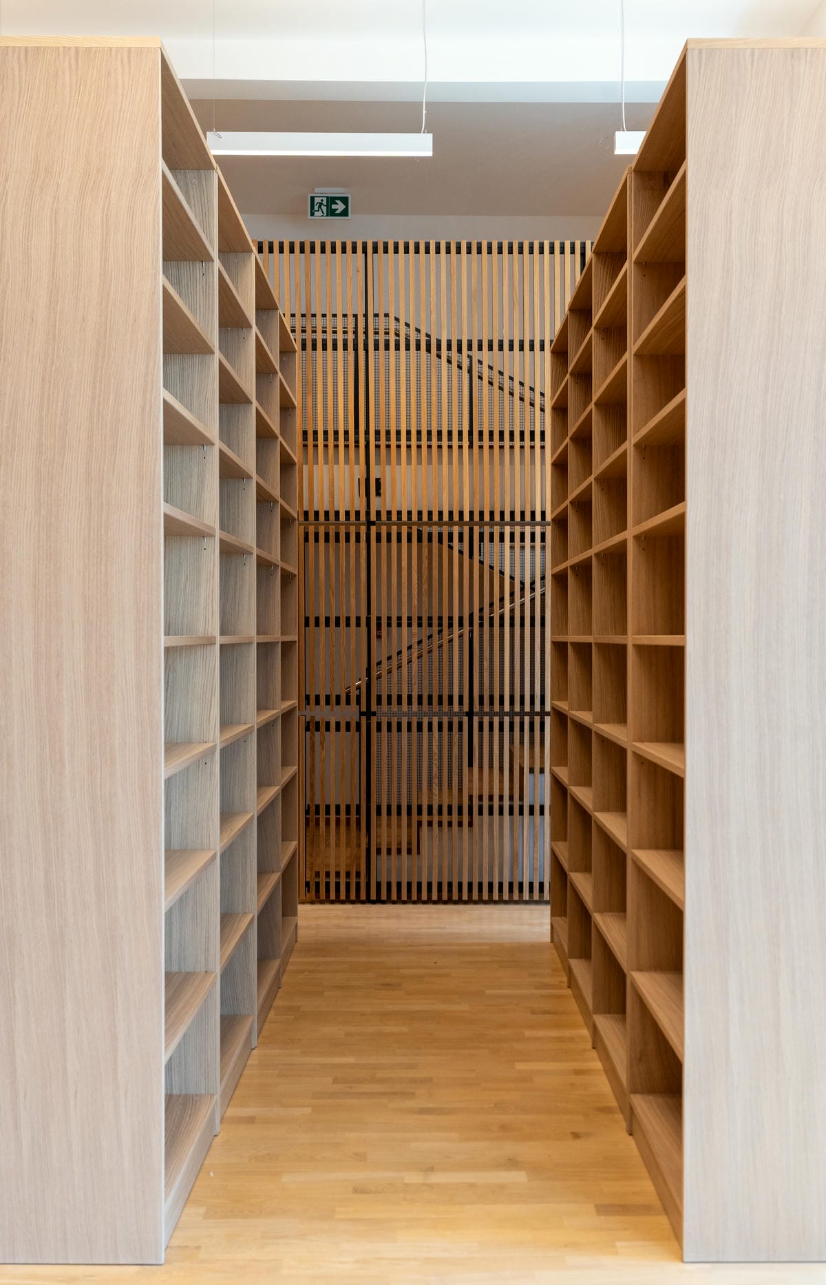 U dijelu centralnog stubišta i glavnih hodnika zidovi su djelomično obloženi akustik drvenim lamelama od svijetlog hrasta različitih širina obloge s ugrađenom linijskom rasvjetom kako bi se vizualno skratila dužina hodnika i poboljšala akustika.