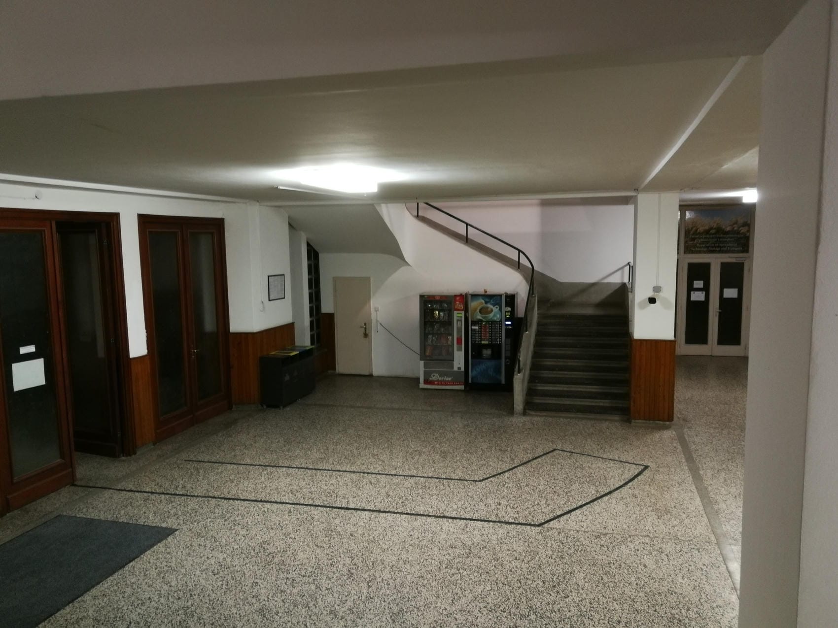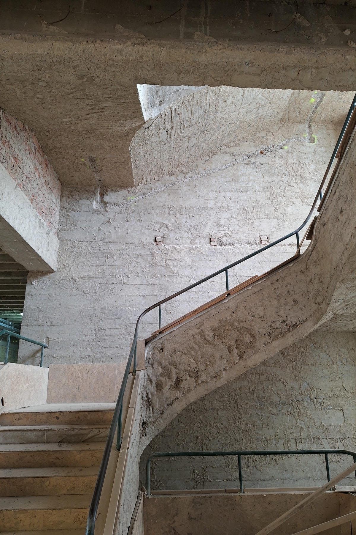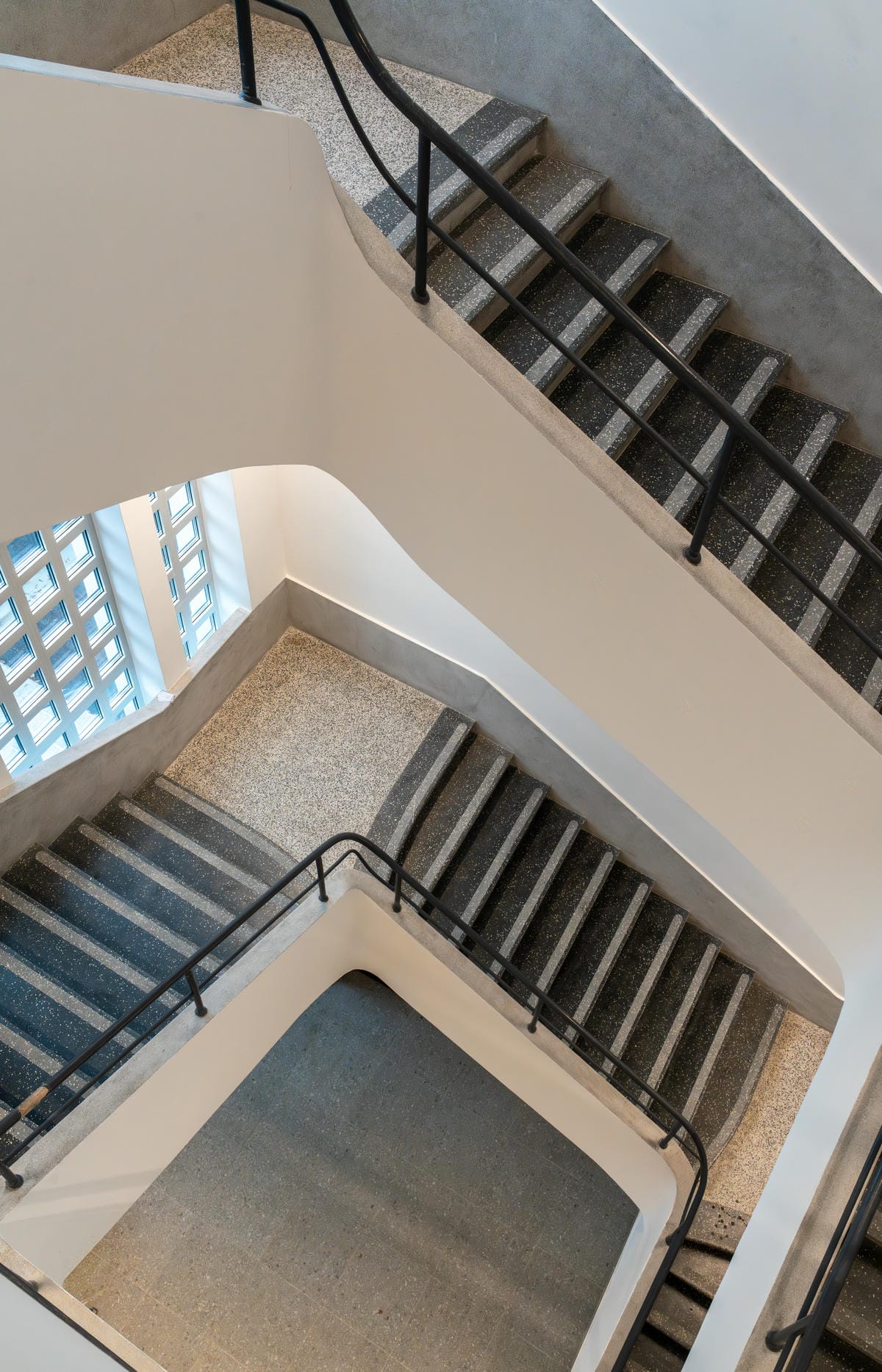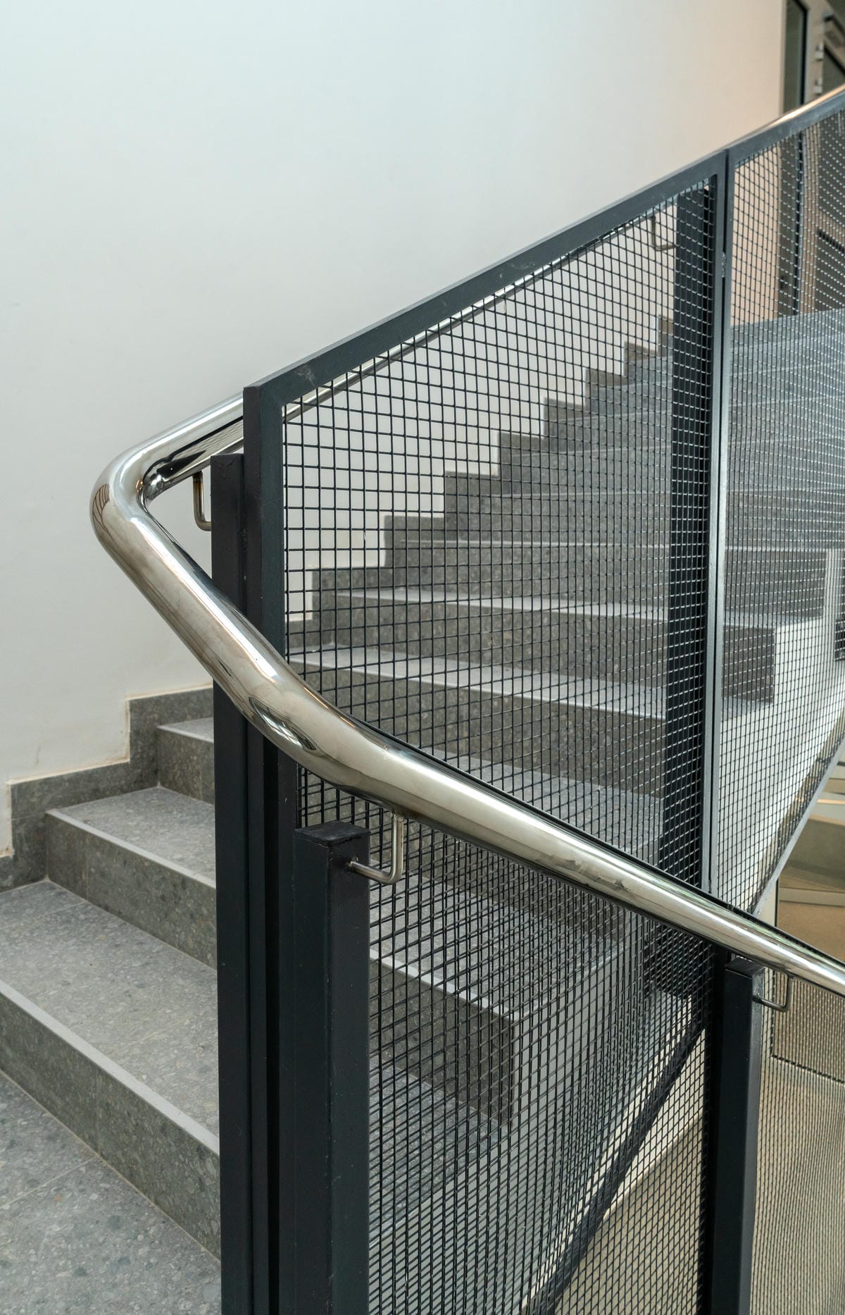 „Postojeća stubišta svojim su oblikovanjem definitivno glavni akcent zgrade zbog čega sam inzistirala da se maksimalno zadrži njihovo originalno oblikovanje, što je uključivalo i zadržavanje završnih obloga. Jedino smo ograde stubišta morali povisiti jer su bile preniske – oko 75 cm i to smo izveli tako da smo na postojeće vertikale zavarili dio cijevi i dodali još jednu horizontalu na polovici visine.“