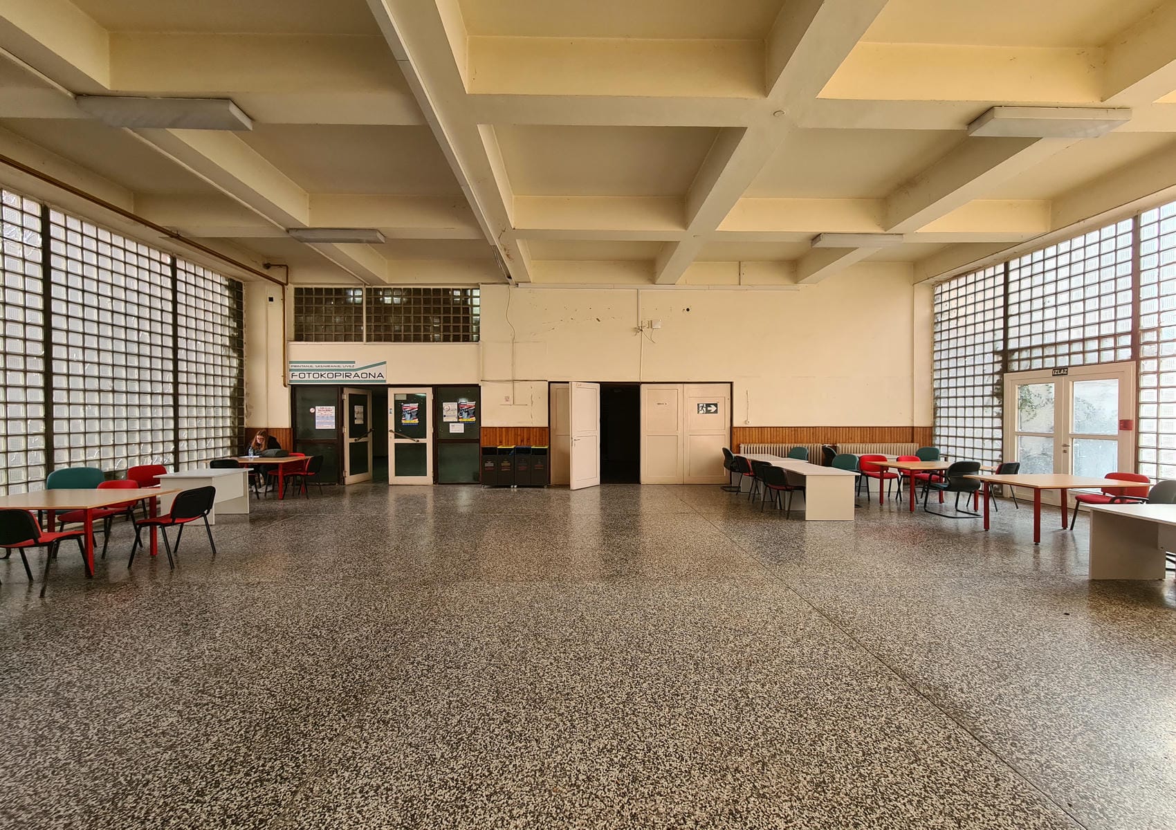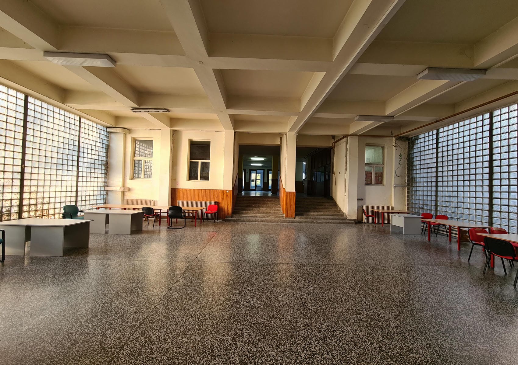 Ulazni hol s pripadajućim prostorima oblikovan je kao jedinstveno uređen prostor. Zatečeni terrazzo pod zamijennjen je keramičkim pločama većeg formata i terrazzo izgleda, postavljenim na svim komunikacijskim površinama u zgradi, osim na onima na kojima se zadržao zatečeni postojeći terrazzo, a to su glavno i dva sporedna centralna stubišta u zgradi Paviljona IV.