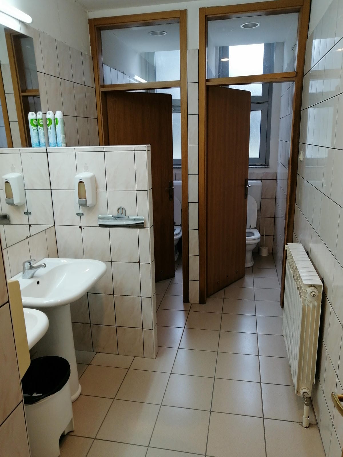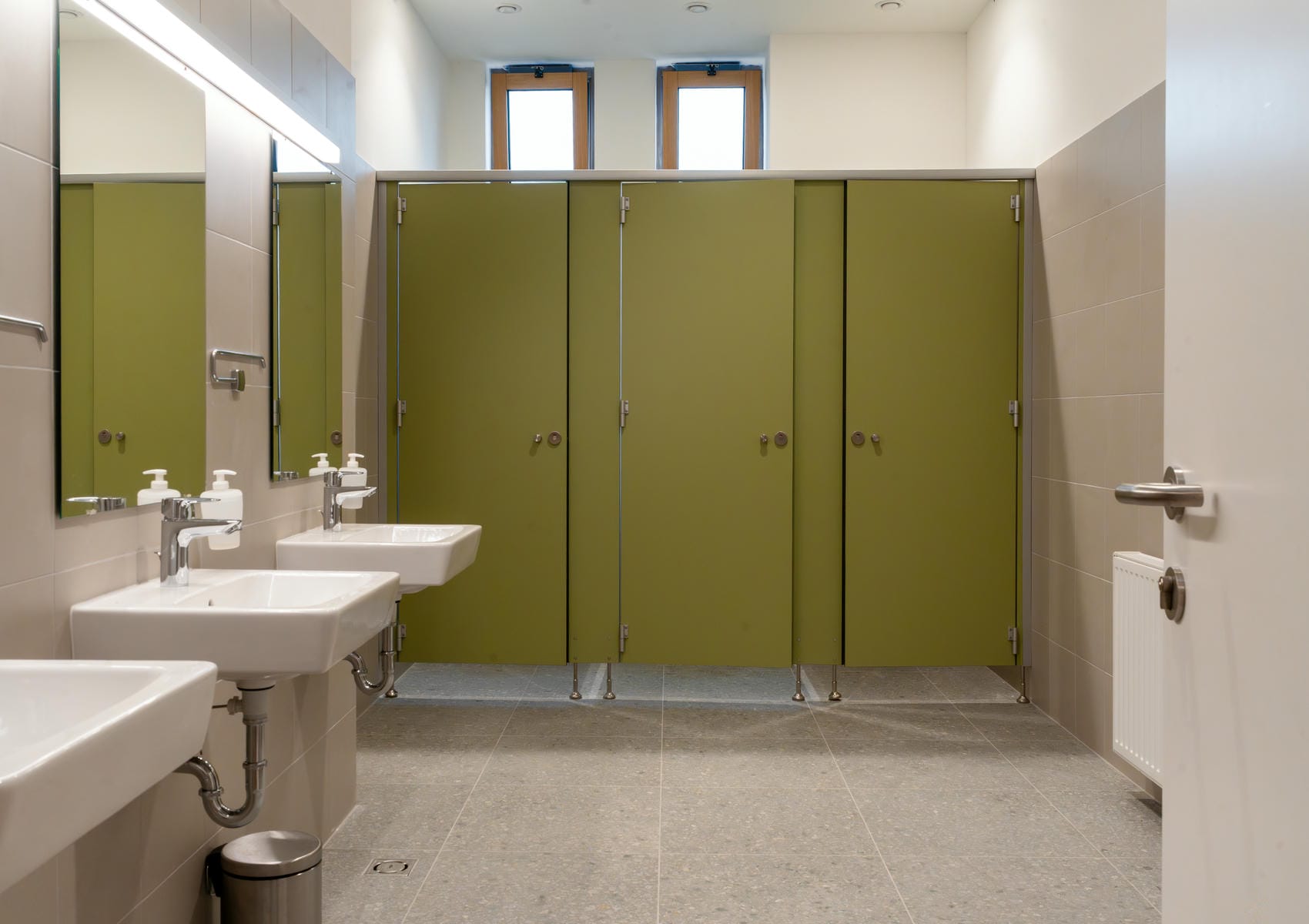 Zidovi i podovi u sanitarnim prostorima obložili su se keramičkim pločicama, a između sanitarnih elemenata ugradile lagane pregrade iz kompakt laminatnih ploča za interijer.