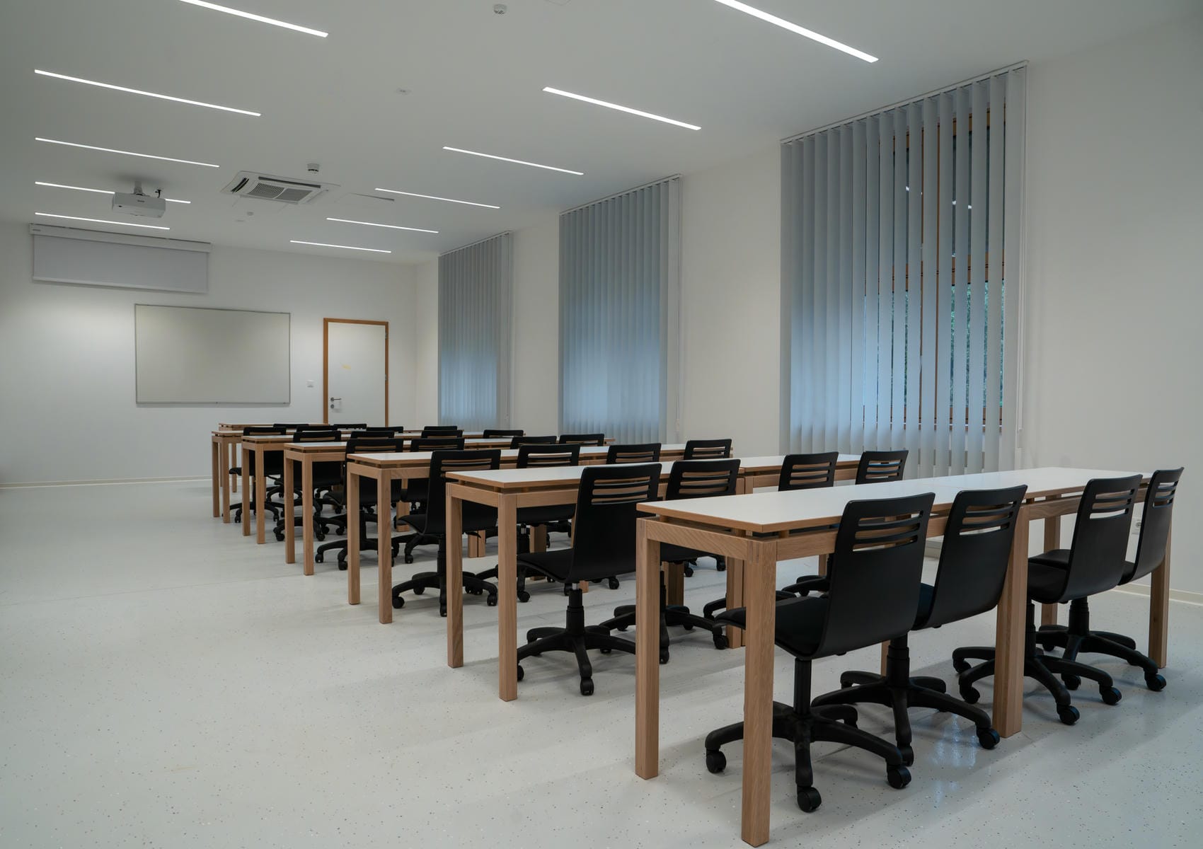 U predavaonicama, uredima i laboratorijima obloge podova variraju, od veće formatnih parketnih daski, epoxy premaza do keramičkih pločica, opet ovisno o namjeni prostorije.