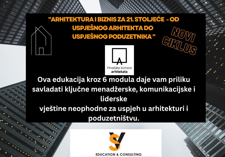 Ako želite naučiti kako voditi svoj posao, a ne da on vodi vas, prijavite se na novi ciklus edukacija o poslovanju "Arhitektura i biznis za 21. stoljeće - od uspješnog arhitekta do uspješnog poduzetnika" u organizaciji Hrvatske komore arhitekata i pod vodstvom poslovne trenerice Sanje Hochberger Varlaj.